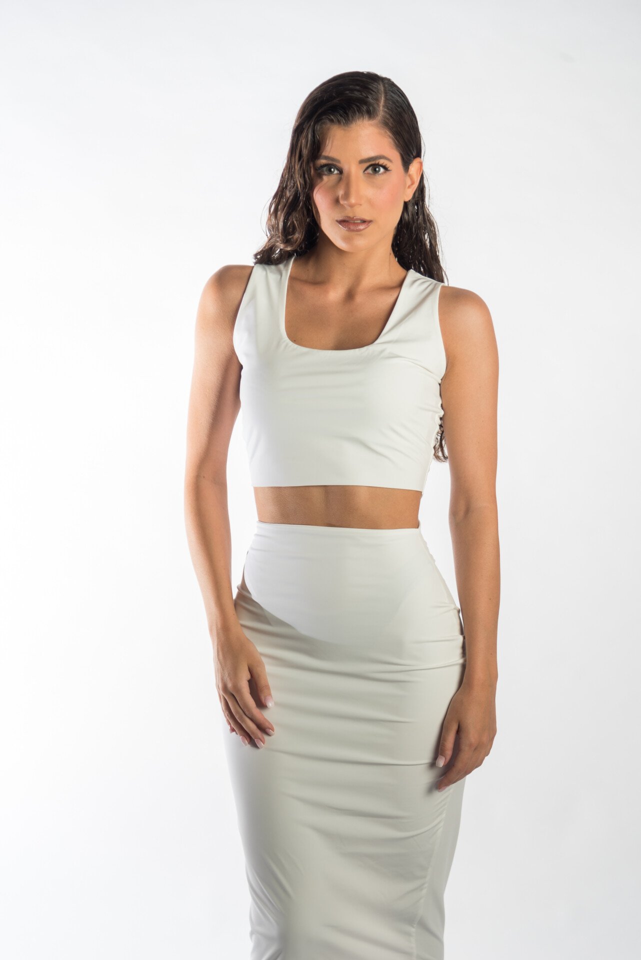 Λευκό maxi σετ με φαρδιά τιράντα. Marta white maxi set με διπλό ελαστικό ύφασμα ζέρσευ.